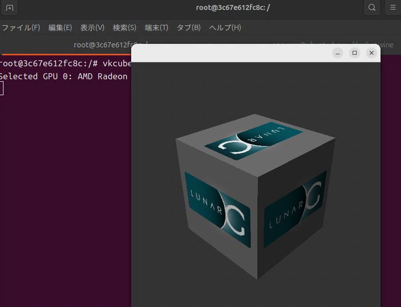 protonなどはD3D12の命令をVulkanの命令に翻訳するものです。ということで、まずはコンテナの中からVulkanを用いた描画がうまく行くかをみてみます。ここでは標準的に入ってくるであろう vkcube を用いて確認をします。 そして実行した結果が以下の通りです。ホストのウィンドウシステム上に コンテナ側で実行したVulkanプログラムの結果が表示されたので、うまく動作していることがわかります。
