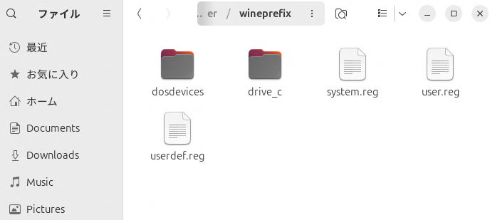 wineboot --initこのコマンドを実行すると、マウントした wineprefix の場所に色々なファイルができあがります。たとえば、drive_c は Windows環境としてのCドライブ(の中身)になります。そのため、このディレクトリ以下にファイルを配置すれば、Windows環境として自然な形になります。