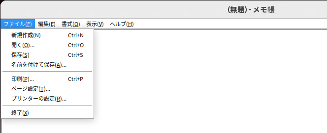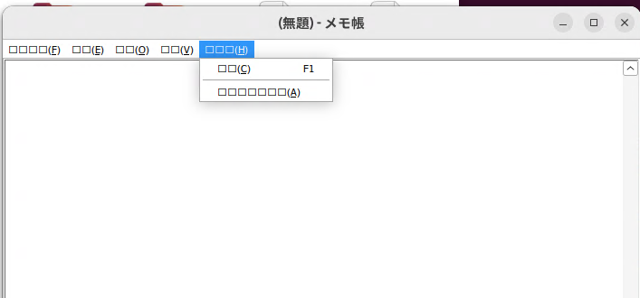 続いて、簡単にメモ帳あたりを動かしてみましょう。以下のコマンドを実行すると、一応 Windowsメモ帳が起動するのですが、日本語フォントなどはうまく表示されません。