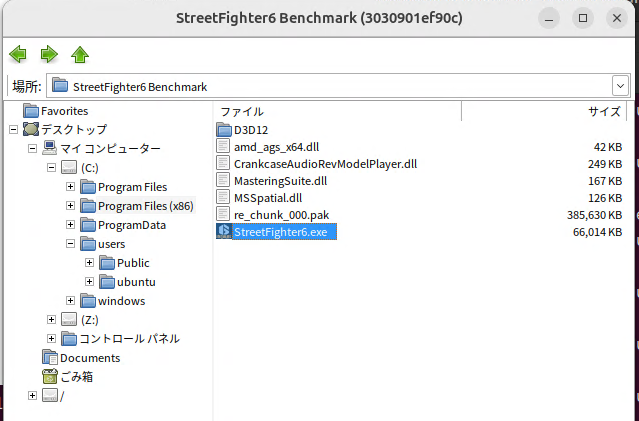 StreetFighter6 Benchmark が zip 形式でインストーラー配布されていたので、これを動かしてみましょう。wineの環境で使えるように展開し、 先程の win-apps/StreetFighter6_Benchmark に用意しておきます。そして、以下のようなコマンドでインストーラーを起動して、wine環境Cドライブにインストールします。