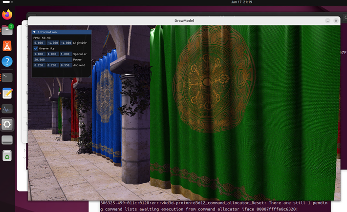 "d3d12core"="native,builtin"wine regedit dx12-overrides.regこうするとようやくD3D12アプリケーションが起動します。以下は私が勉強用に作っていたD3D12サンプルプログラムです。”wine DrawModel.exe” という感じでの起動コマンドになりますが、このexeの場所をカレントに指定して起動するようにしています。