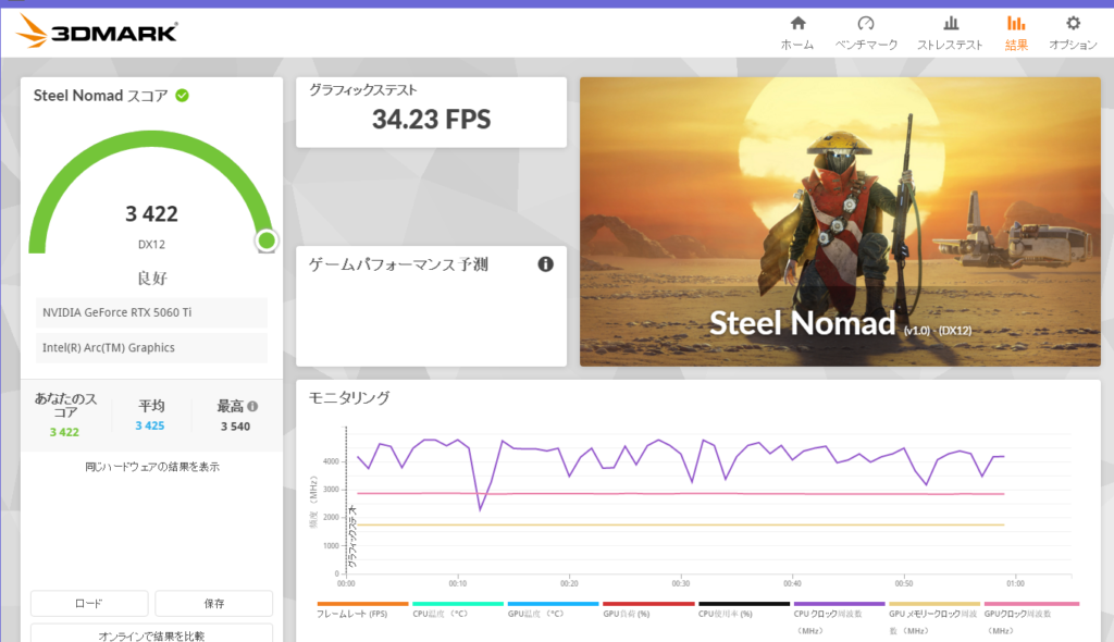 3DMarkのベンチマークを動作させ、GPUに負荷を与えてみました。内蔵GPUより性能は出るものの、直接PCI-expressに装着したときよりはパフォーマンスダウンがあるように思います。また、画面出力をeGPU側からやっていなかったのも影響の1つです。その他の点として、ノートPC故、CPUの弱さも出ているかもしれません。