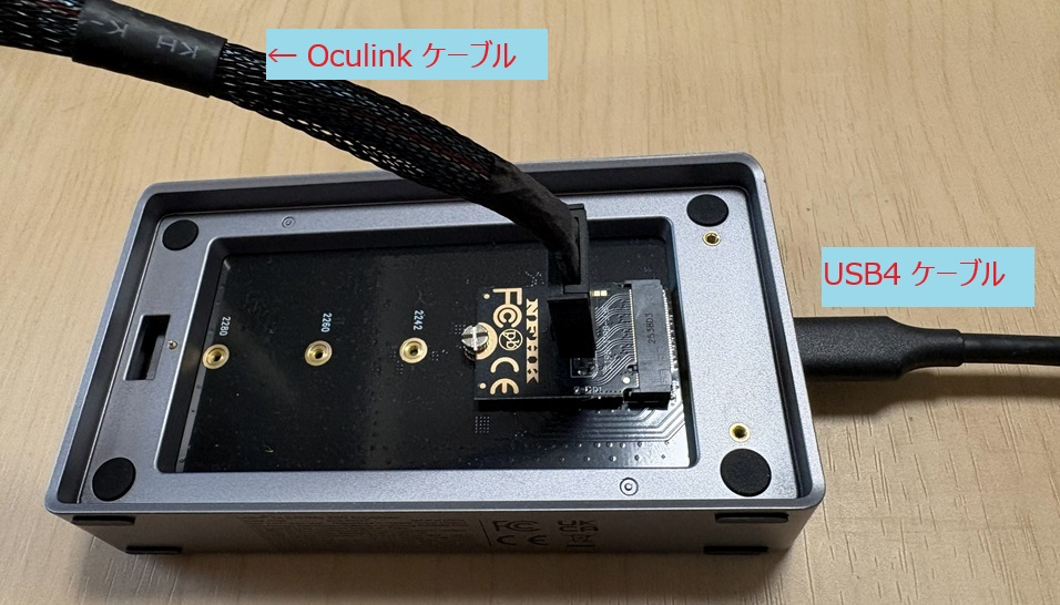 NVMe SSDを装着するところに、 Oculink 変換アダプタを装着して、準備完了です。あとはeGPU側とOculinkケーブルで繋いでおきます。