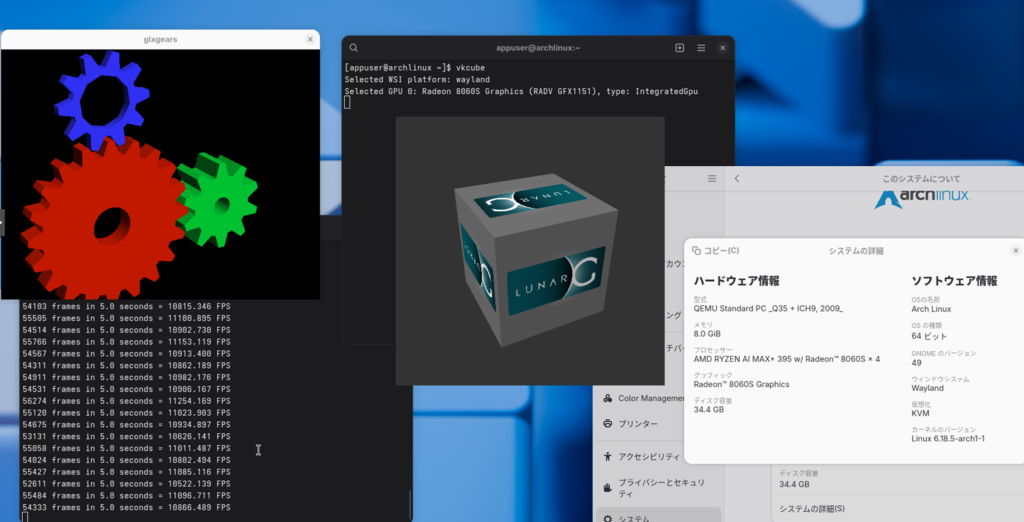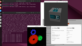 hostpci3: 0000:c5:00.6,pcie=1このようにして設定を行い、UbuntuおよびArchlinuxを起動したときの様子が以下の通りです。どちらもGPUをパスしており、仮想マシンの環境ながらもGPUを認識しています。注意点として、2つの環境を同時に使うことはできません。パススルーしているGPUが同じなので、別々に撮影しました。
